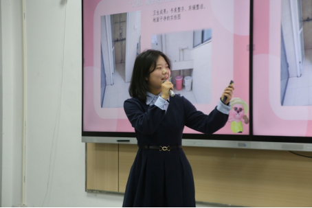 活动现场氛围热烈融洽,活动流程紧凑而富有温度。选手演讲环节,各寝室代表依次登台,通过精心制作的PPT,生动展现了宿舍窗明几净的整洁环境、成员间互帮互助的暖心瞬间与各具特色的寝室文化:有的以“学习互助角”凝聚奋进力量,打造沉浸式备考氛围;有的通过“每周大扫除+创意装饰”巧思,让宿舍变身充满烟火气的温馨小家;在问答互动中,选手们围绕寝室管理规范对答如流,充分彰显了对规章制度的烂熟于心。第二轮分享中,代表们细数轮流值日、睡前交流、学科互助等建设细节,让文明寝室的内涵从“环境整洁”延伸至“心灵相依”,赢得阵阵掌声。