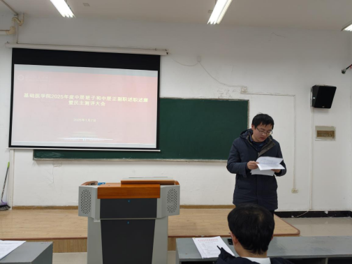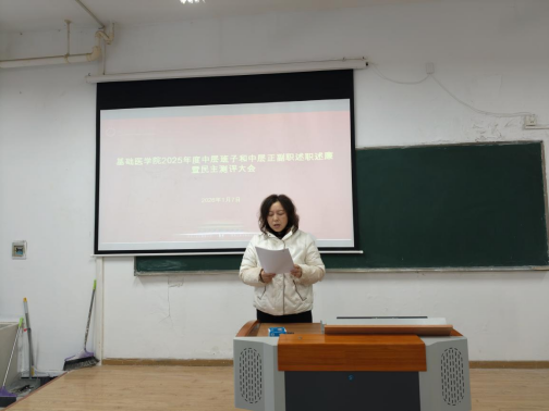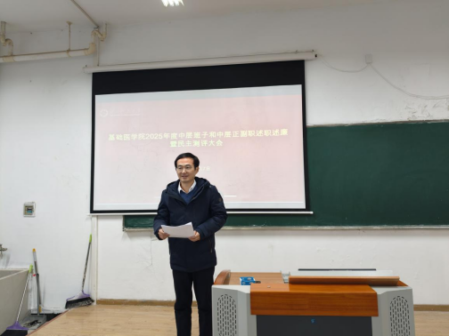 (通讯员:洪莹莹,审核:晏彪 程梦琳)为全面总结回顾过去一年的工作成效,科学谋划下一年学院发展蓝图,2026年1月7日下午,基础医学院2025年度中层班子和处级干部述职述廉暨民主测评大会在医药楼1栋307室召开。学院领导班子成员、全体教职工参加会议,会议由学院党委书记程梦琳主持。
