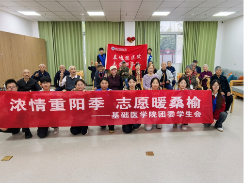 活动尾声,全体志愿者与老人在康养中心院内合影留念,定格下这段温暖的时光,这既是青春与岁月的对话,也彰显了医学生以专业服务老年群体的初心。此次活动中,队员们以倾听陪伴给予老人精神慰藉,更将医学素养融入服务,为“敬老爱老”添上“医学赋能”底色。基础医学院未来将持续探索医学生参与养老服务的创新模式,以“医学生视角”提供专业人文兼具的志愿服务样本,引导学子结合国家应对老龄化战略贡献青春智慧,助力社会向“老有所养、老有所医、老有所乐”稳步迈进。