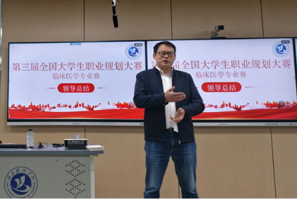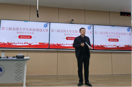比赛最后,佘同辉作总结讲话。他强调职业规划不是空洞的口号,而是从职业认知到路径设计的完整闭环,其关键在于明确目标与树立理想。他鼓励同学们珍惜大学时光,尽早确立职业目标,将个人理想融入医学事业发展。针对大赛设置的两大赛道,他特别指出,成长赛道要以职业目标为导向,脚踏实地付诸行动;就业赛道要精准锚定求职方向,在学习与思考中锤炼本领,最终实现职业理想。他希望全体医学生以此次大赛为契机,不断夯实专业基础、锤炼综合素养,在医学道路上稳步前行,用扎实的专业能力与坚定的职业信念,书写医者仁心的精彩篇章。