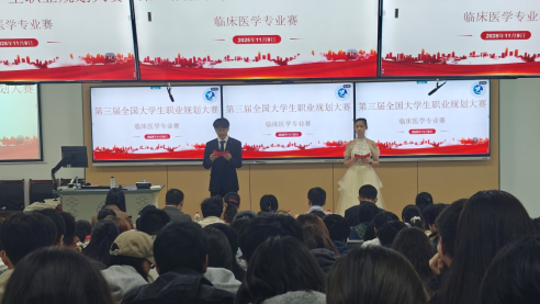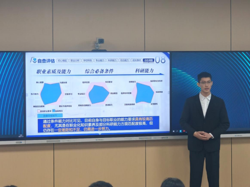 在自我评估环节,选手们结合自身性格特质、专业成绩与学习实践经历,精准分析个人与目标职业的匹配度,展现了当代医学生清晰的自我认知。唐永松同学以“一以贯之,迈向未来”为主题,将个人职业规划与国家医疗战略需求紧密结合,从基层医疗服务缺口分析、个人医学素养提升路径、阶段性学习计划制定、科研能力培养方向等多个维度,系统阐述了自己的职业发展思路。此外,其他选手也通过分享专业课学习成果、学科竞赛经历、科研项目参与过程、临床实习感悟及志愿服务故事,全方位展示了在专业技能、沟通协调、应急应变等方面的综合能力,充分彰显了医学生的青春风采,赢得评委与观众的一致认可。